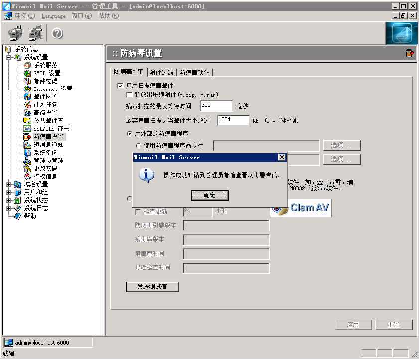 (7)打开Winmail Server管理工具,发送病毒测试信。