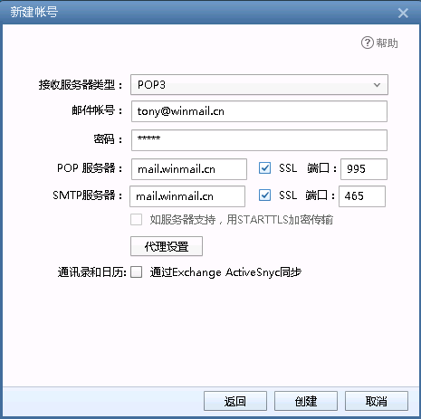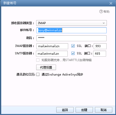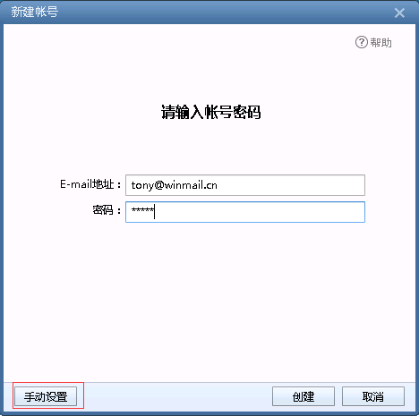 输入完整的邮件地址:tony@winmail.cn和密码。点击“创建”,只要域名相关的解析做好,Foxmail可以自动取得相关的地址和端口。当然也可以点击“手动设置”。