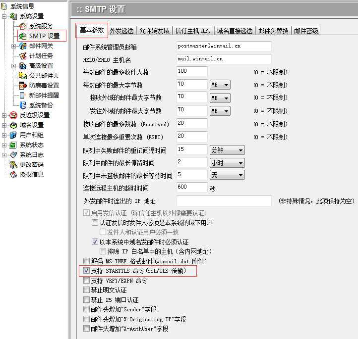 SSL连接只要保证相关端口开启即可,如果使用TLS连接,Winmail必须开启以下选择: