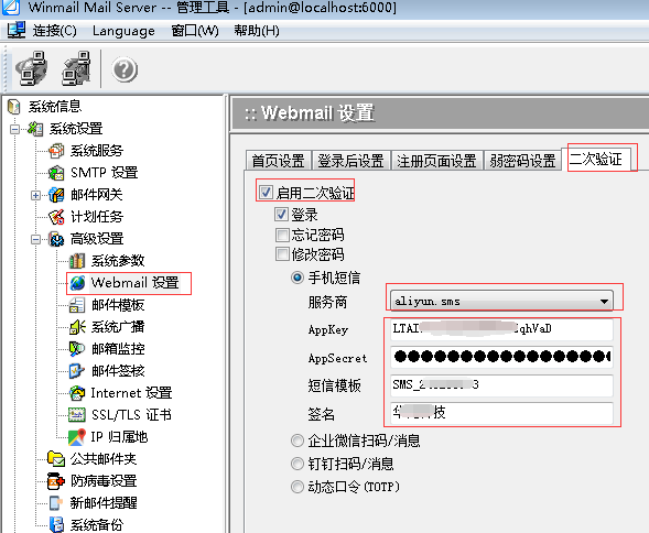 Winmail 7.2 起支持这个功能,只支持 Webmail 浏览器登录邮箱,不支持邮件客户端和手机APP,本文以阿里云短信为例,其他平台可以参考设置。