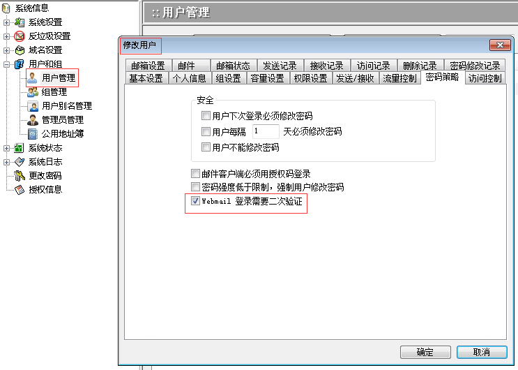 2、针对某个邮箱用户属性里设置"密码策略" - "Webmail 登录需要二次验证"(启用二次认证必须要选中,哪怕上面没有选择“登录”)。
