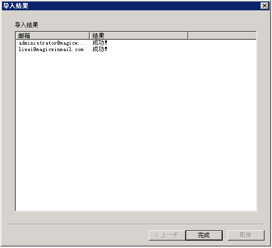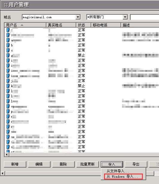 从 AD 域中一次性导入用户到 Winmail 中。在 Winmail 管理工具 - 用户和组 - 用户管理 - 选择 magicwinmail.com 域后,选择导入。