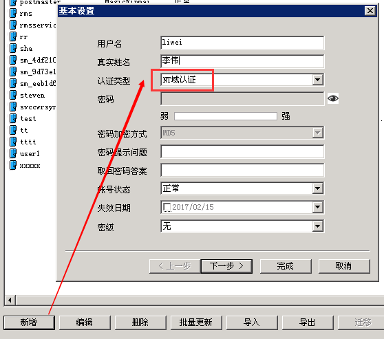 打开 Winmail 管理工具 - 用户和组 - 用户管理 - 新增,新增用户名以 李伟 为例,邮件用户名必须和 AD 中的登陆名一致,设置为 liwei,认证类型选择 “NT域认证”