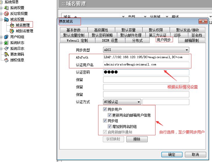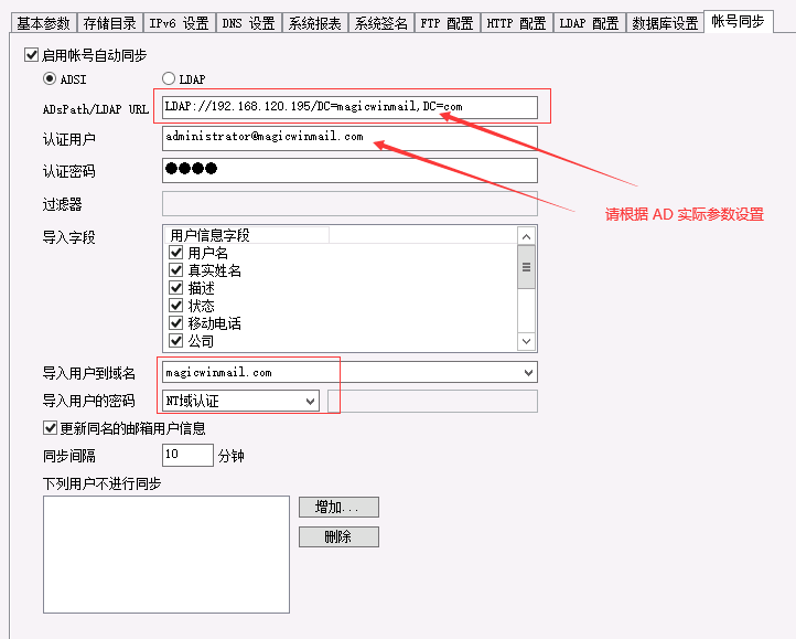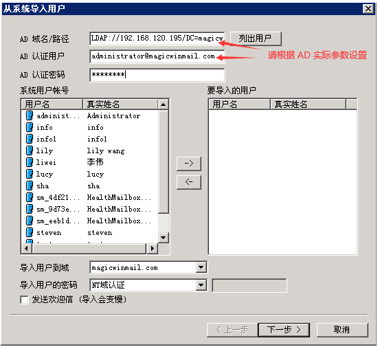 AD 域为 magicwinmail.com,写为 LDAP://192.168.120.195/DC=magicwinmail,DC=com,导入时,导入用户的密码项选择为 “NT域认证”