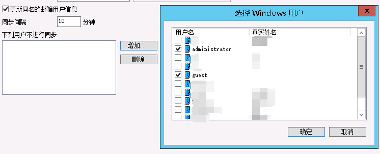 如果有不想同步的用户,比如 GUEST,administrator 等用户,可以点击增加,把对应的用户加入不同步列表。