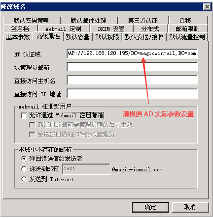 Winmail管理工具 - 域名设置 - 域名管理双击 magicwinmail.com 域名,高级属性中配置 NT 认证域,使用 LDAP://192.168.120.195/DC=magicwinmail,DC=com