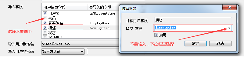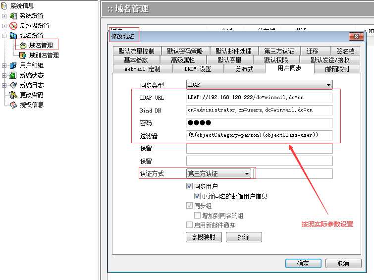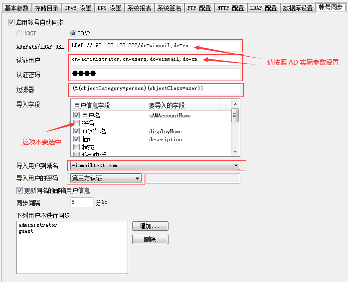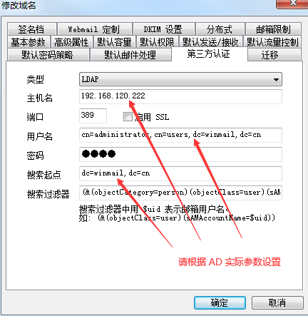 #上面参数都是示例,设置时请按照实际 AD 参数;AD 域名和 Winmail 域名可以相同,也可以不同