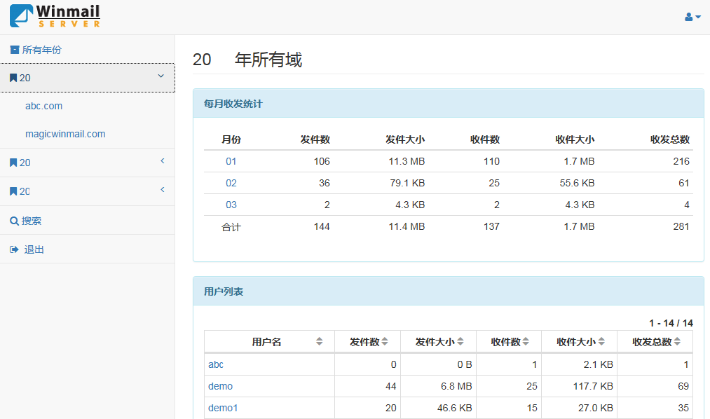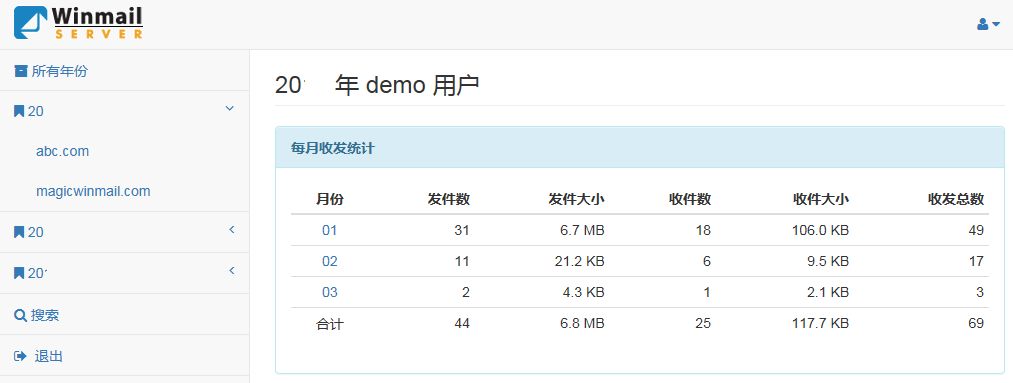 如下图查看2017年、域名abc.com、用户demo归档邮件