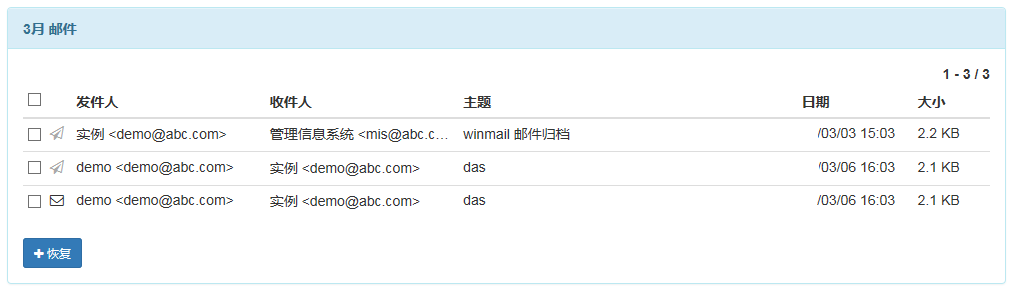 选择一个或者多个要恢复的邮件,点击“+恢复”后,系统将邮件恢复到对应用户的"收件箱"和"已发送",然后对应的用户可以登录网页或者邮件客户端查看邮件。