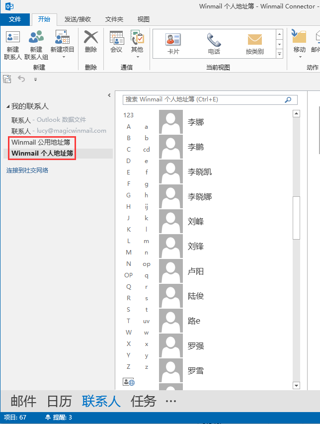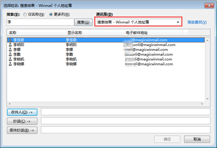 选择“Winmail 个人联系人”或者“Winmail 公共联系人”,搜索收件人或高级查找。