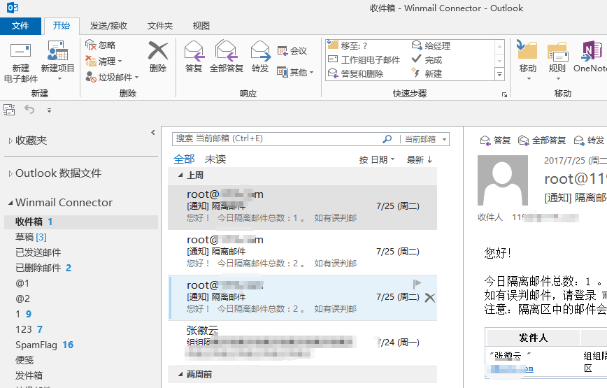 重新启动 Outlook 后,邮件会下载到 Outlook,在Outlook的“邮件”项中可以查看邮件夹和邮件内容。