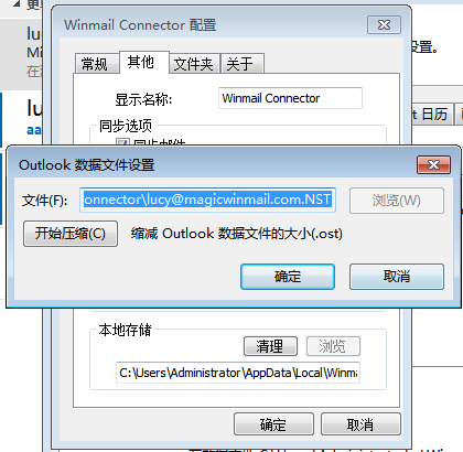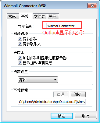 点击“其他”,在“显示名称”中设置邮箱帐号在Outlook中的显示名称。配置是否同步邮件、联系人。是否显示进度条。默认可以不修改。