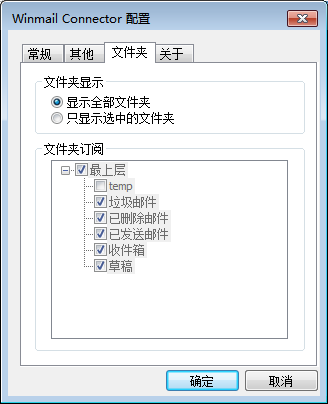 点击“文件夹”,配置IMAP要显示的邮件夹。如果邮件夹量大或者邮件多,可以考虑不要全选,只选择日常使用的邮件夹,可以提高收发速度。