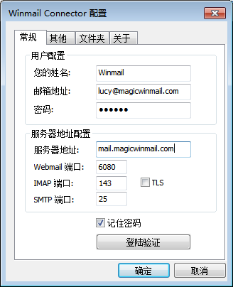邮箱地址:填写Winmail中的邮箱用户的邮件地址,不管主域还是普通域都要把邮件地址写全。