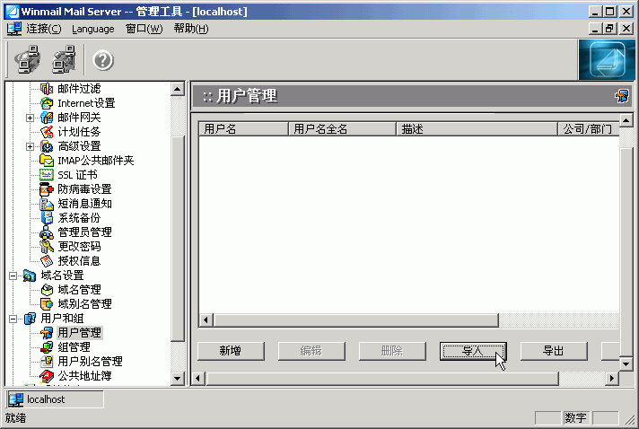 3.打开Winmail Server管理工具,进入用户管理,导入邮箱。