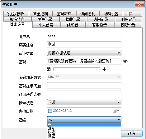 Winmail 管理工具》用户和组》用户管理中编辑用户,密级包括:无、限制、秘密、机密。