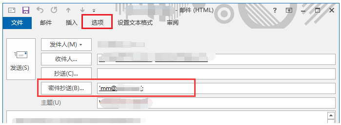 主题、内容后,点击菜单栏中“选项”“密件抄送”。在密件抄送中填写虚拟密级邮箱后,点击发送。