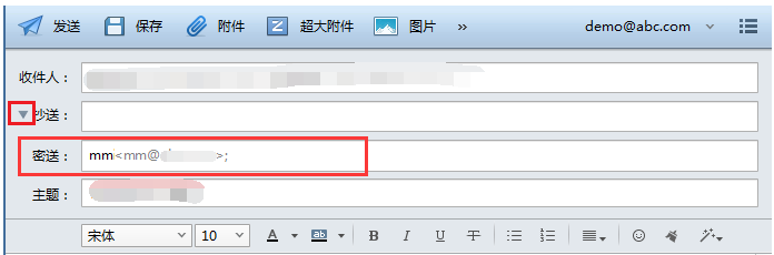 主题、内容后,点击抄送前面的三角箭头显示密送,在密送中填写虚拟密级邮箱后,点击发送。