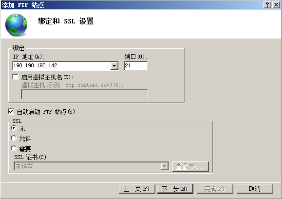 选择你希望开放的IP地址(默认选择全部未分配,即所以IP都开放)和端口(默认选择21);SSL请根据您的具体情况选择,如无需使用SSL,请选择“无”;选择“下一步”;