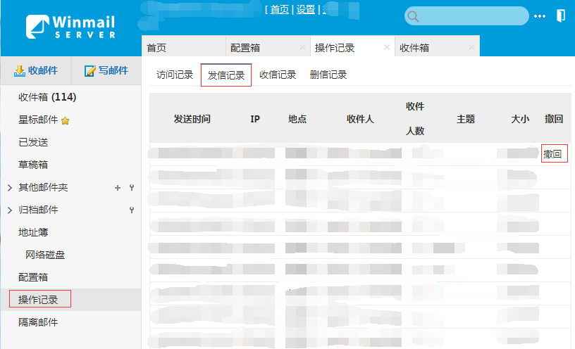 6. Winmail 7.0 以上版本,可以在 Webmail '操作记录' - '发信记录' 里撤回,包含客户端发信。操作方法见本文底部图片