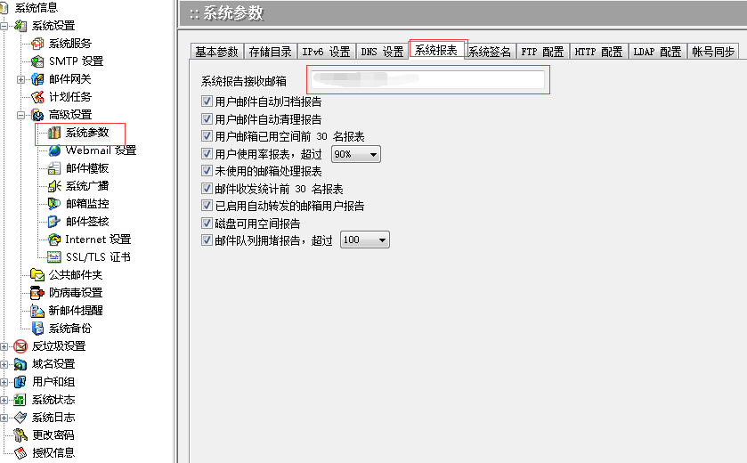 用户邮件自动归档报告(用户在 Webmail "其他邮件夹"里设置) 用户邮件自动清理报告(管理员在"计划任务里增加了“清除用户的邮件”任务") 用户邮箱已用空间前 30 名报表 用户使用率报表,超过*% 未使用的邮箱处理报表(管理员在"计划任务里增加了“处理未使用的邮箱”任务") 邮件收发统计前 30 名报表 已启用自动转发的邮箱用户报告 磁盘可用空间报告 邮件队列拥堵报告,超过*