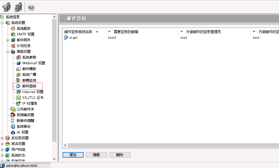 内部邮件的管理员签核: 需要邮件签核的邮箱发邮件到本域时,需管理员列表中任一管理员签核。