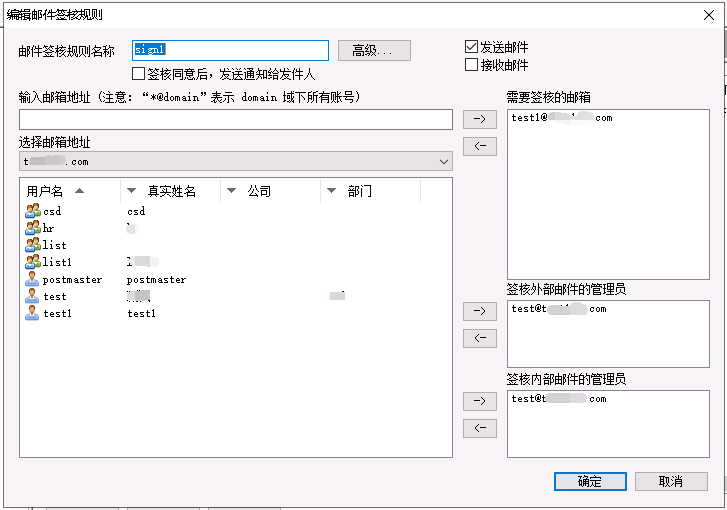 输入邮件地址: 可以输入某个邮箱地址或指定域名下的所有邮箱。当输入 *@domain 时, domain 域下的所有邮箱都要签核。