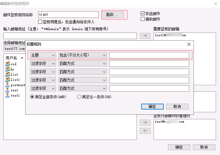 当需要设置邮件签核条件时,可以点击“高级...”来设置条件规则。