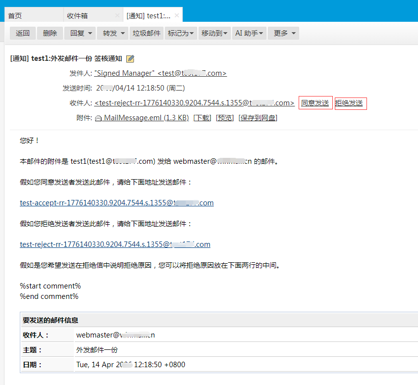 如果签核人拒绝了,发件人会收到一封拒绝提醒邮件。如果同意发送,邮件会发出,没有提醒邮件。多个签核管理员,一个管理员操作了签核流程就结束了,也不支持多层级。