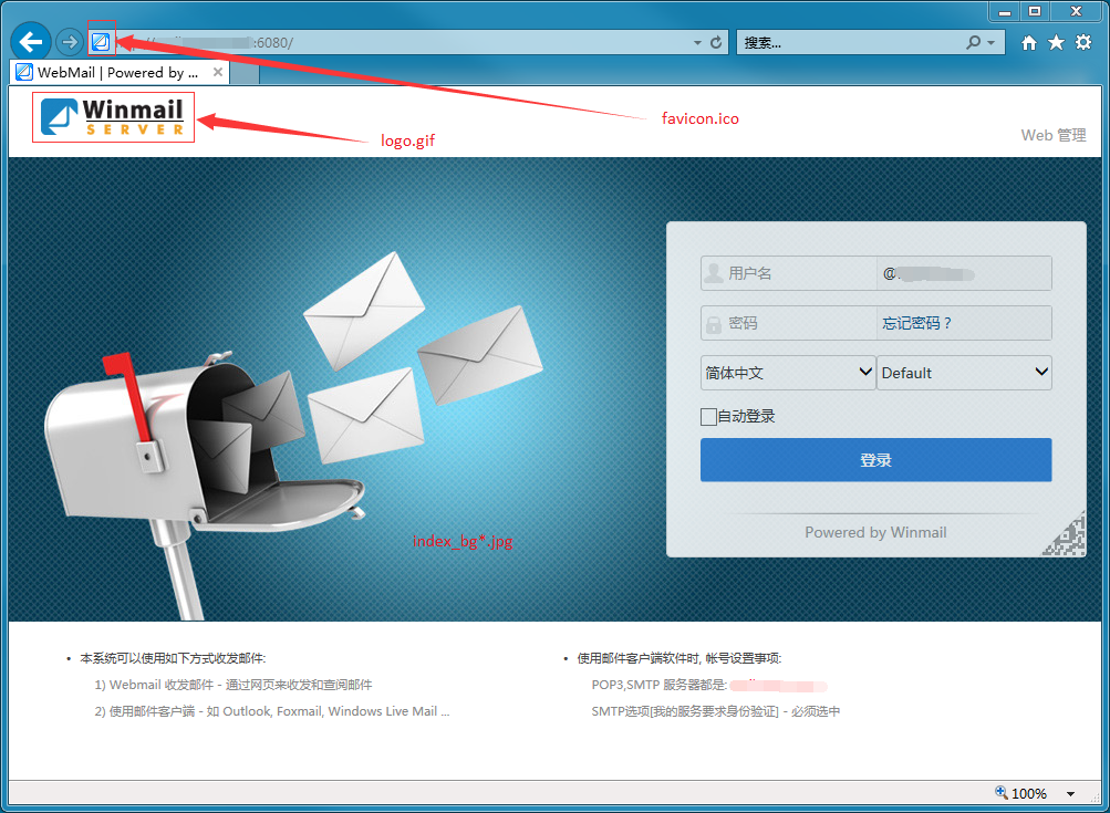 管理员可以根据企业需求,在 Winmail 邮件服务器软件的 Webmail 中定制自己企业的LOGO以及相关信息,部分可以直接在软件里面设置或者替换实现,部分需要通过修改web页面代码实现的。 这部分我们不提供具体的技术支持,一般不建议修改,需要客户自己研究,修改前请务必备份相关文件! (注意 txt 和 php 文件不能使用 Windows 自带的记事本修改,会导致格式有问题,可以下载安装 Notepad-- 软件修改,注意非图片文件都是 utf-8 格式)