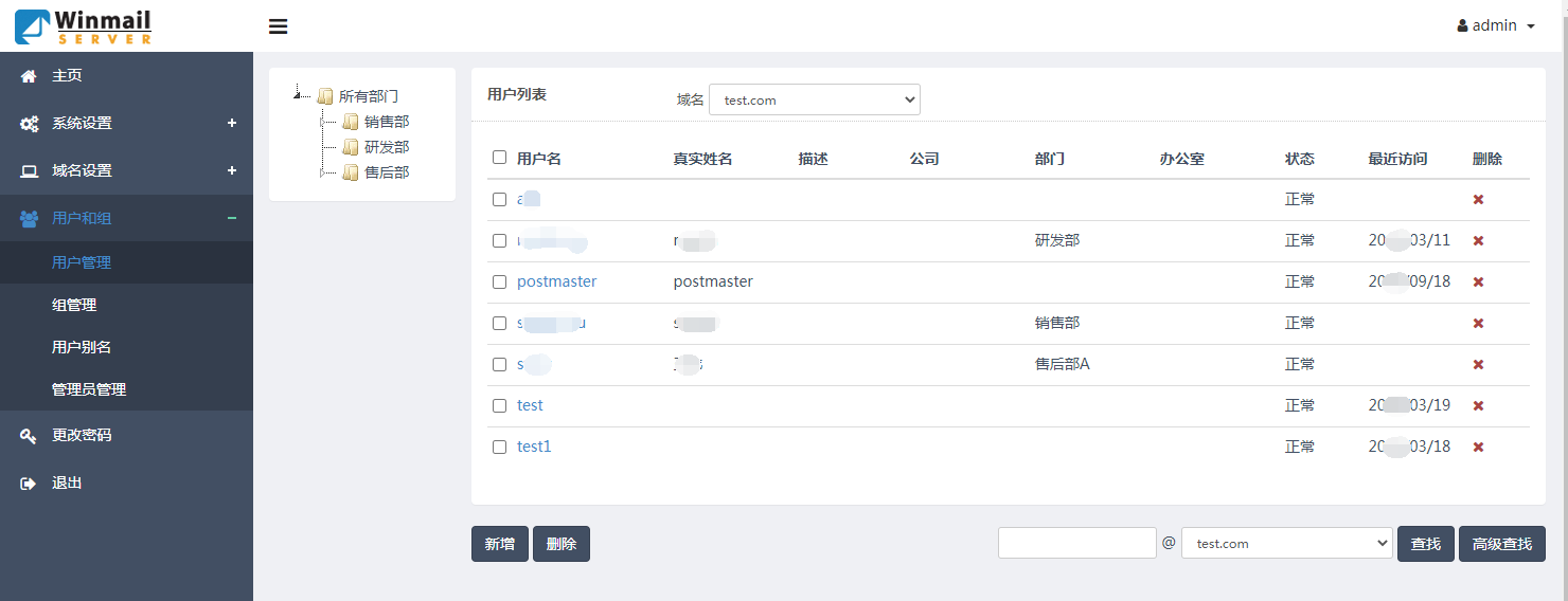用户登录后,管理员可以对有权限域名及域名下的用户,组和别名进行管理。