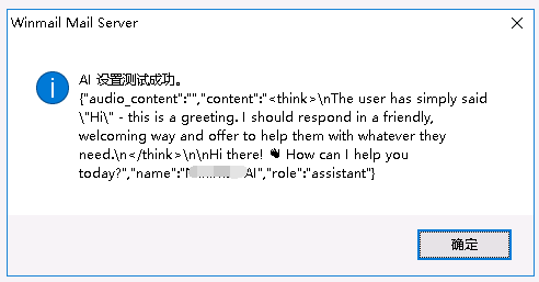 点“测试”,如果提示“AI 设置测试成功”就说明成功了,应用保存一下。如果提示“AI 设置测试失败”,根据弹出的信息,检查各设置参数、服务器网络。