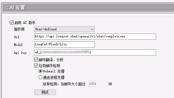 可对接 DeepSeek、Qwen、MiniMax、Kimi 等主流 AI 大模型开放平台 API,Webmail 支持多语种翻译、垃圾邮件检测、生成回复、内容归纳和退信分析等功能。[企业版、旗舰版]支持后台邮件递送进程垃圾邮件检测。使用外部大模型平台需要服务器可以连接外网。