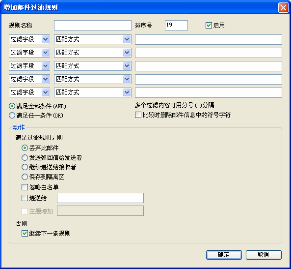 | 动作 | 满足条件:丢弃、发送通知信给发送者、继续递送给接收者、保存到隔离区。同时也可以设置递送给某个用户。 递送给栏目可以增加多个邮件地址,各邮件地址用分号(;)分隔开。 不满足条件:可以继续过滤规则或终止过滤过滤规则。 |