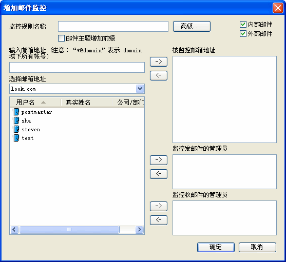 | 选择邮箱地址 | 从列表中列出的所有内部邮箱中选择一个(批)邮箱,增加到“被监控邮箱地址”、“监控发邮件的管理员”或“监控收邮件的管理员”列表中。 |