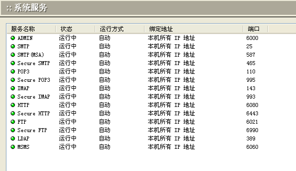 | ADMIN 服务 | 本邮件系统所用的管理服务,管理工具可以通过此服务对邮件系统服务器进行的管理,此服务不能停止。如果此服务启动失败,则邮件系统不能正常运行。ADMIN 是 SSL 安全传输协议加密的。 |