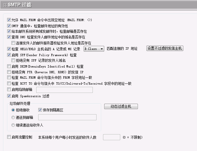 | 启用 SpamAssassin 过滤 | 启用知名的垃圾邮件过滤软件 SpamAssassin 来对可疑邮件进行检查过滤。 SpamAssassin 过滤是采用判断邮件是否符合某种特征并加以评分的方法来对邮件进行分类。 有关 SpamAssassin 介绍参考 https://spamassassin.apache.org/ |