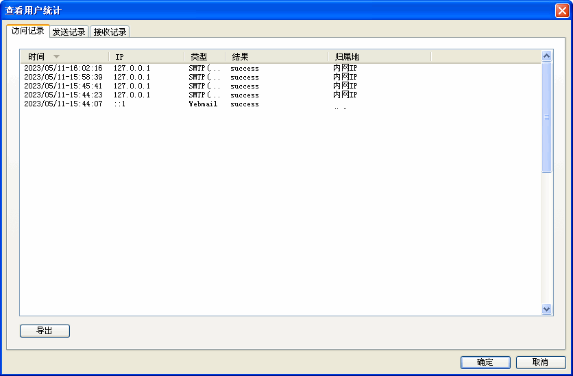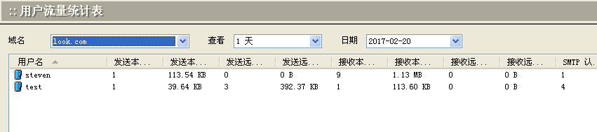 用户流量统计表¶ [企业版、旗舰版功能] 显示各邮箱用户每天的发送邮件个数和字节数等数据,可以按照某个字段排序,让管理员可以分析系统运行情况,及时发现异常邮箱。 双击一个用户,可以显示该用户的详细访问记录、发送记录、接受记录。