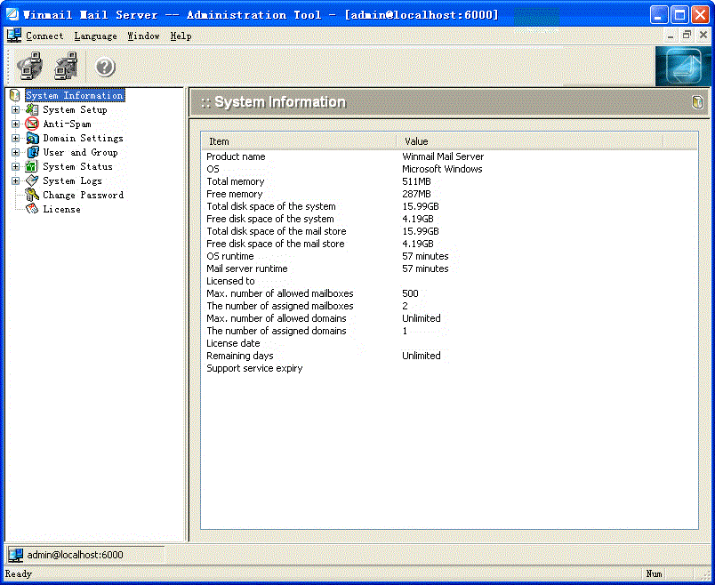 4.Click OK to login. The Winmail Server Administration Console Tool will display a screen similar to the following.