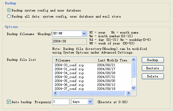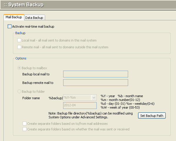 | Backup | Check the appropriate box to back up either, or both: 1)Local mails - local sender, local recipient 2)Incoming mails - remote sender, local recipient 3)Outgoing mails - local sender, remote recipient 4)Relayed mails - remote sender, remote recipient |