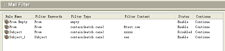 The administrator can set up filters to apply to email during delivery. Select the Mail Filter option from the Winmail Server main menu. The following screen will appear.
