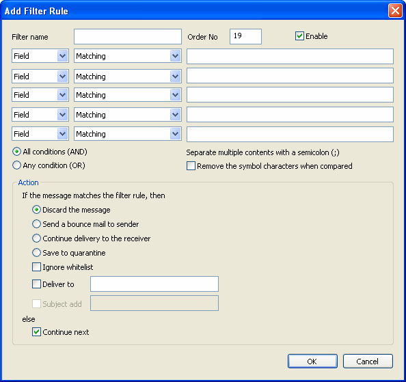 To create a new mail filter, click the Add button at the bottom of the screen. The following dialog box will appear.