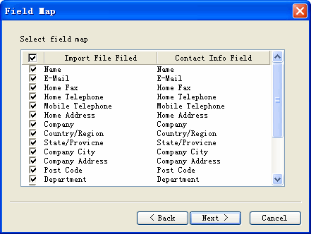 - The path will now appear in the Export file text box. Click the Next button to bring up the Field Map.