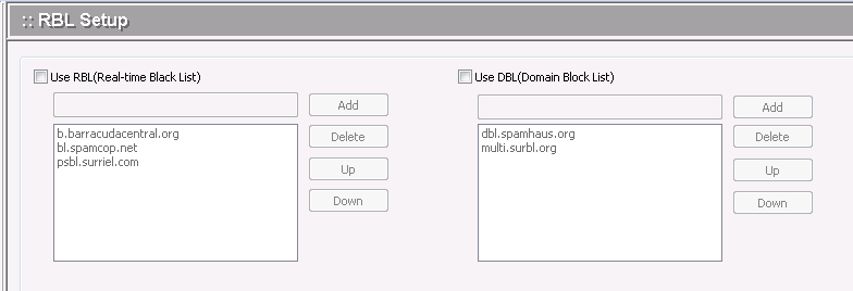 .To delete an RBL server domain name, select it from the list and click the Delete button.