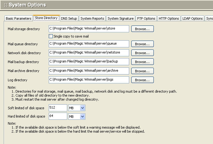 Note: Directories for mail storage, mail queue, and mail backup should be different. If you make a change to a mail path, be sure to copy the current target directory structure into the new target directory.