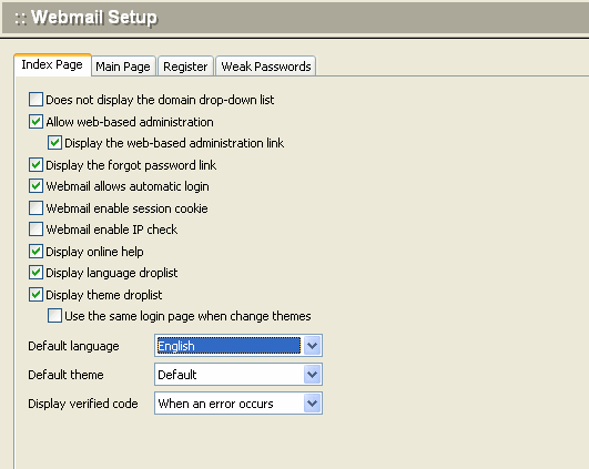 | Display the web-based administration link | Check this box to allow the web administration link to appear as a link on the Webmail login page. |